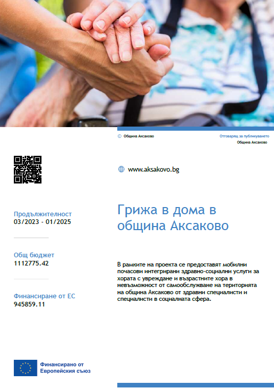 Проектът цели подкрепа на възрастни хора и лица с увреждания чрез услуги в домашна среда. В рамките на проекта ще се предоставят почасови мобилни интегрирани здравно-социални услуги за хората с увреждане и възрастните хора в невъзможност от самообслужване на територията на община Аксаково от здравни специалисти и специалисти в социалната сфера. В рамките на проектното предложение ще се осигури грижа в домашна среда на 119 лица от целевата група от 30 домашни помощници, рехабилитатор, психолог и медицински сестри.